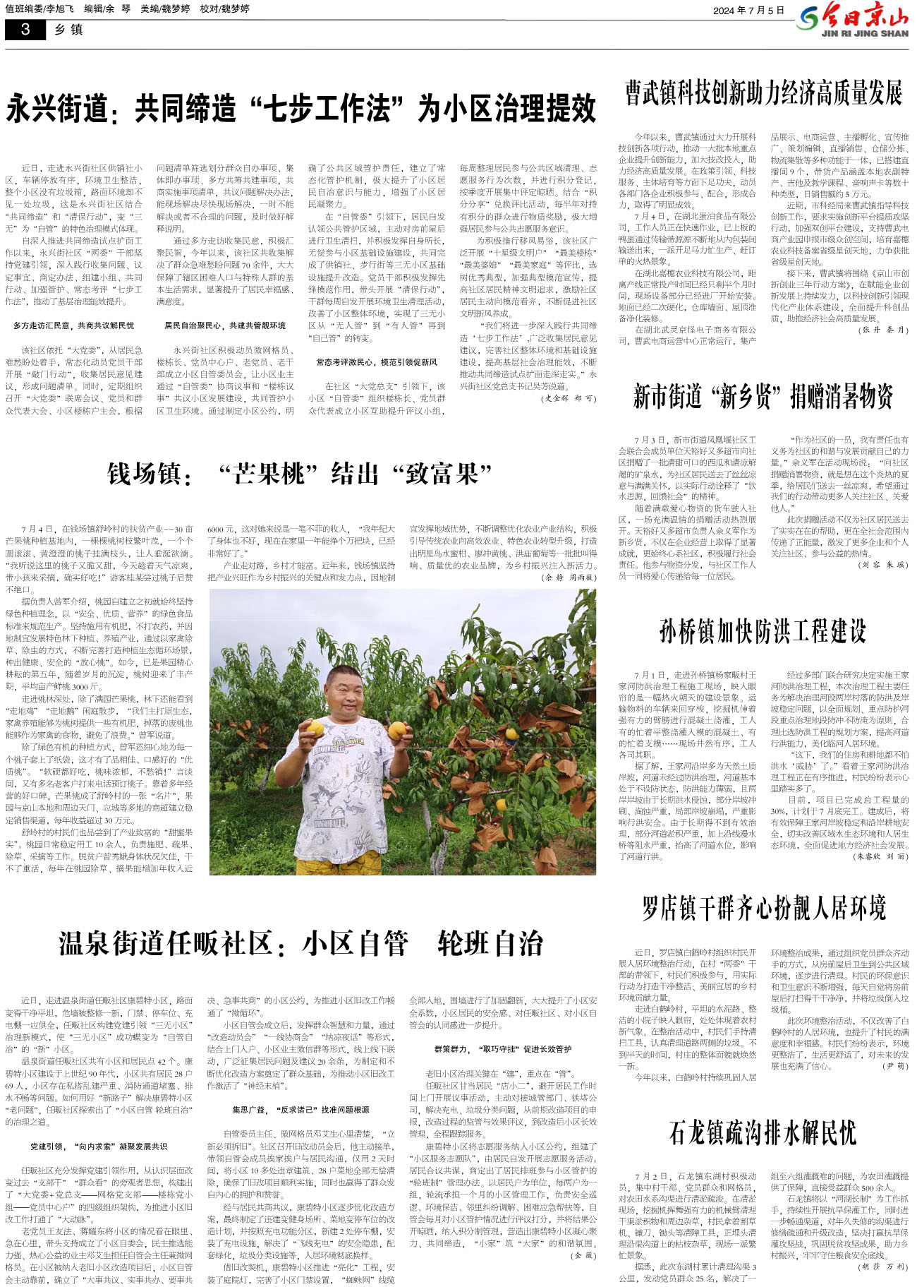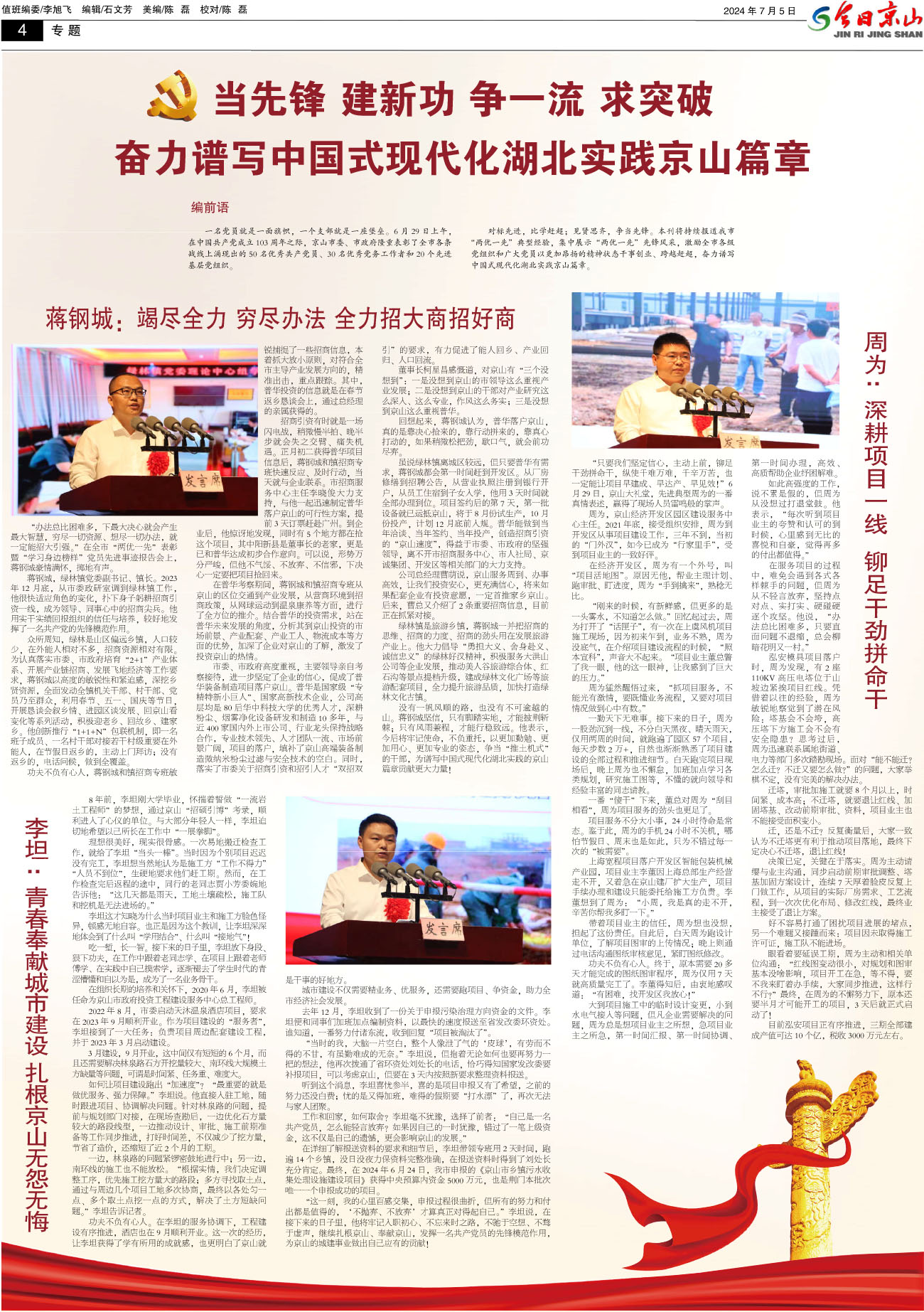 今日京山第一版 全市“两优一先”表彰暨“学习身边榜样”党员先进事迹报告会召开 国家体育总局青少司司长李辉来京山调研体校建设工作 全省农村寄递物流助推农产品上行培训班在京山举行 市委常委会(扩大)会议暨市“四大家”领导联席会议召开 湖北首批户用轻质组件光伏示范项目在永兴落户 用实干和实绩向党的生日献礼
