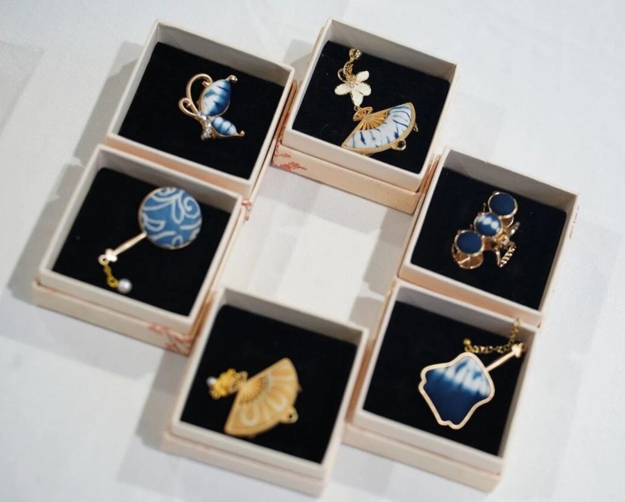 扎染/印花胸针系列(京山市己木彩染植物染料印染工作室)产品秉持 “惜物而行” 的理念,收集扎染、蜡染、蓝印花布等非遗技艺制作后的珍贵布头,避免边角料废弃。设计上巧妙融合流行饰品托与 “己木彩染” 独家染制的蓝染、黄栌染面料,实现传统非遗技艺与当代时尚的深度对话。每一件胸针都是独一无二的手工制品,承载着手工温度与品牌印记,让非遗文化以潮流配饰的形式走进日常生活。