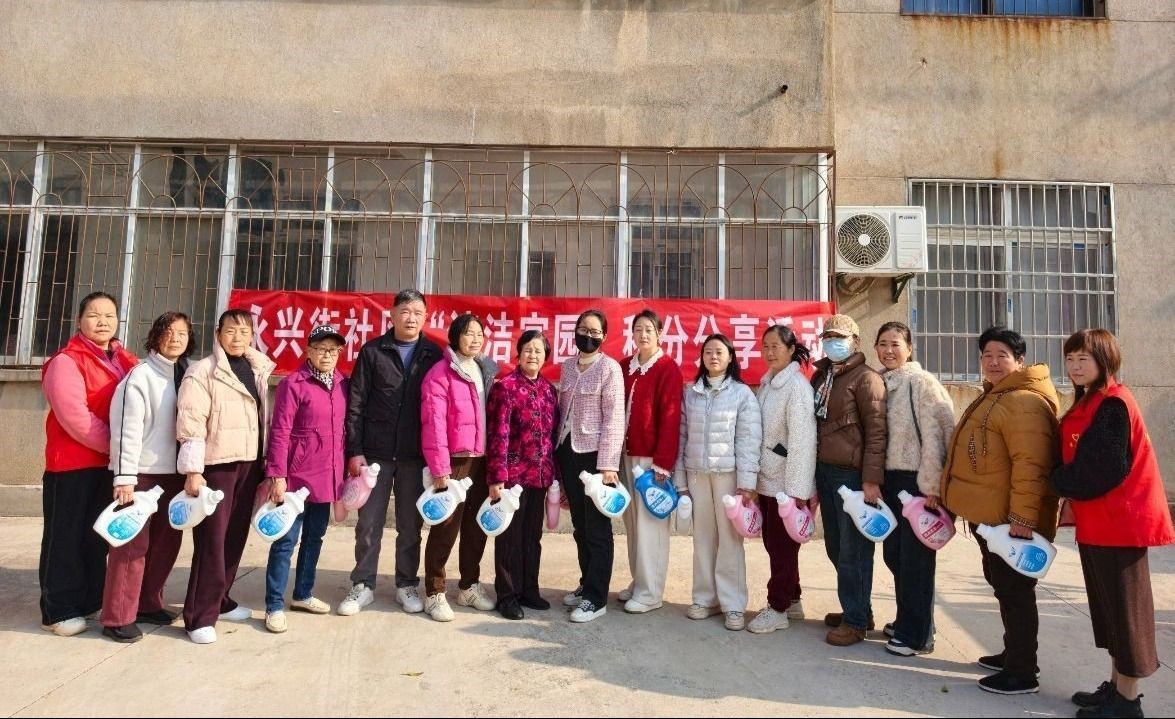 3月12日,永兴街道永兴街社区组织开展“清洁家园”积分分享活动,为20余名居民志愿者兑换洗衣液、纸巾等奖励物资。