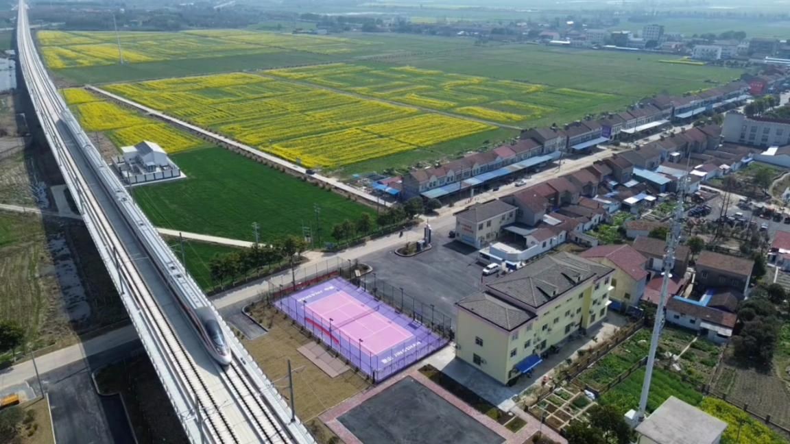 金黄花海随风轻摇,紫色网球场点缀其侧,一黄一紫相映成趣,勾勒出别致的乡村春色。一列高铁疾驰而过,与花海、球场同框入镜,动静相融、古今相映,绘就一幅自然与现代交融的春日画卷。